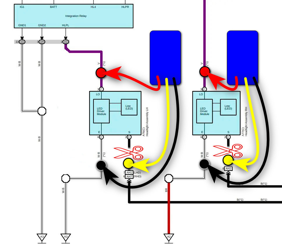Lexus CT200h Схема підключення емулятора LED фар Автор emulator.admin | 16 Лютого, 2025 0 коментарів Чхема підключення емулятора